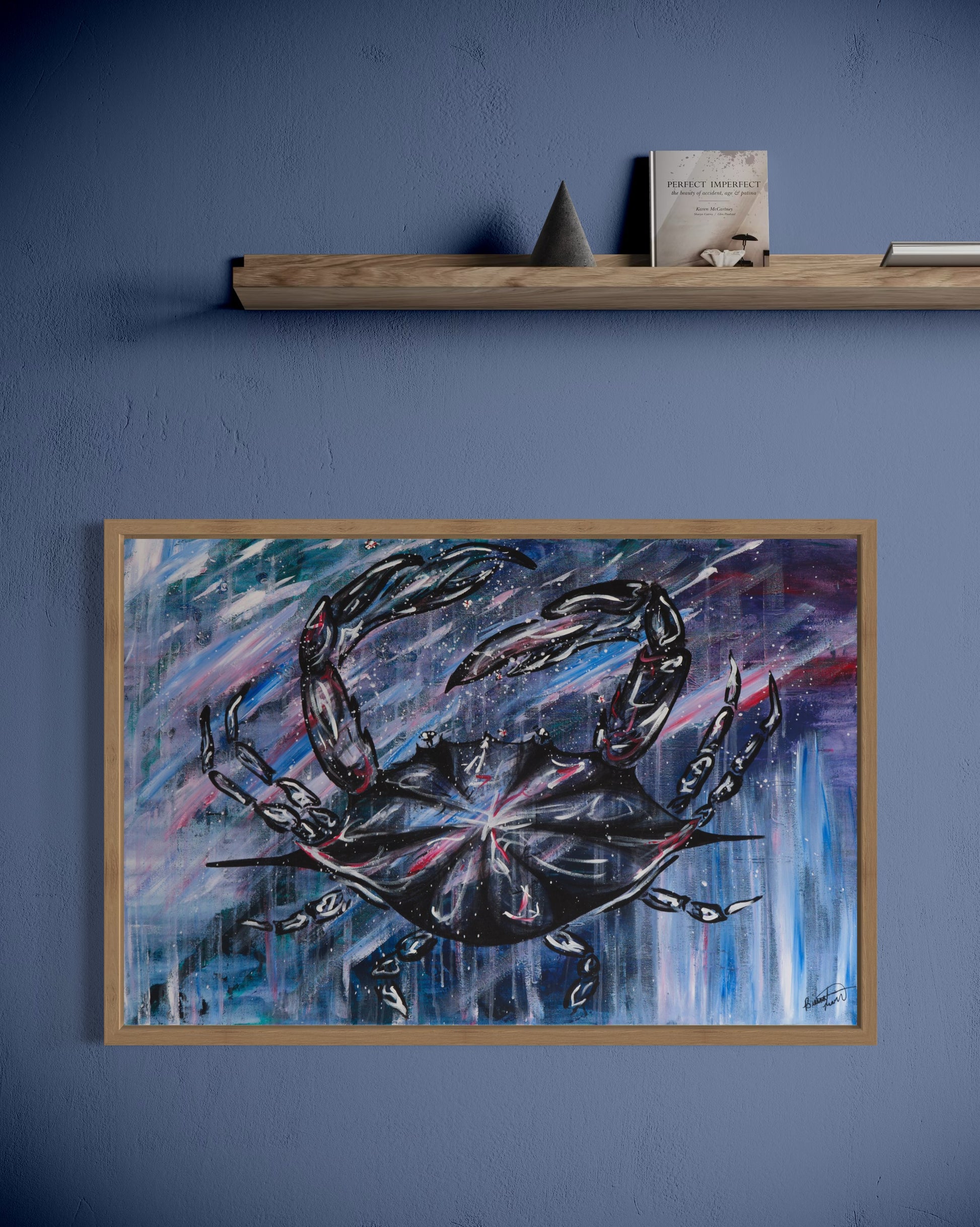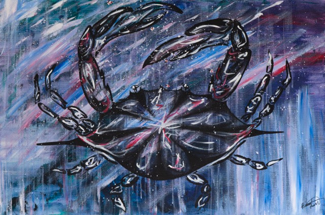 Karkinos is a 36 x 24" oil painting that embodies the Cancer horoscope through a dynamic, cosmic vision of the crab. Its form is outlined in sharp, expressive strokes of black, set against a swirling background of red, blues and violets that evoke the night sky. The creature’s shell reflects streaks of starlight, merging astrology with myth. Both fierce and protective, the painting captures Cancer’s dual nature. Resilient on the outside, deeply sensitive within, transforming the zodiac symbol into a celestial guardian.