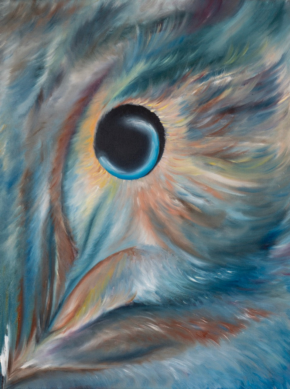 This 24 x 18" is an Expressionist oil painting that captures the penetrating gaze of an owl. The composition magnifies the eye, rendering it is a central sphere surrounded by an aura of color. Feathers dissolve into sweeping strokes of blue, gray, and ochre, conveying both motion and atmosphere. This piece emphasizes mood and perception over detail, turning the owl's eye into a symbol of nocturnal vision in a state of silent watchfulness.