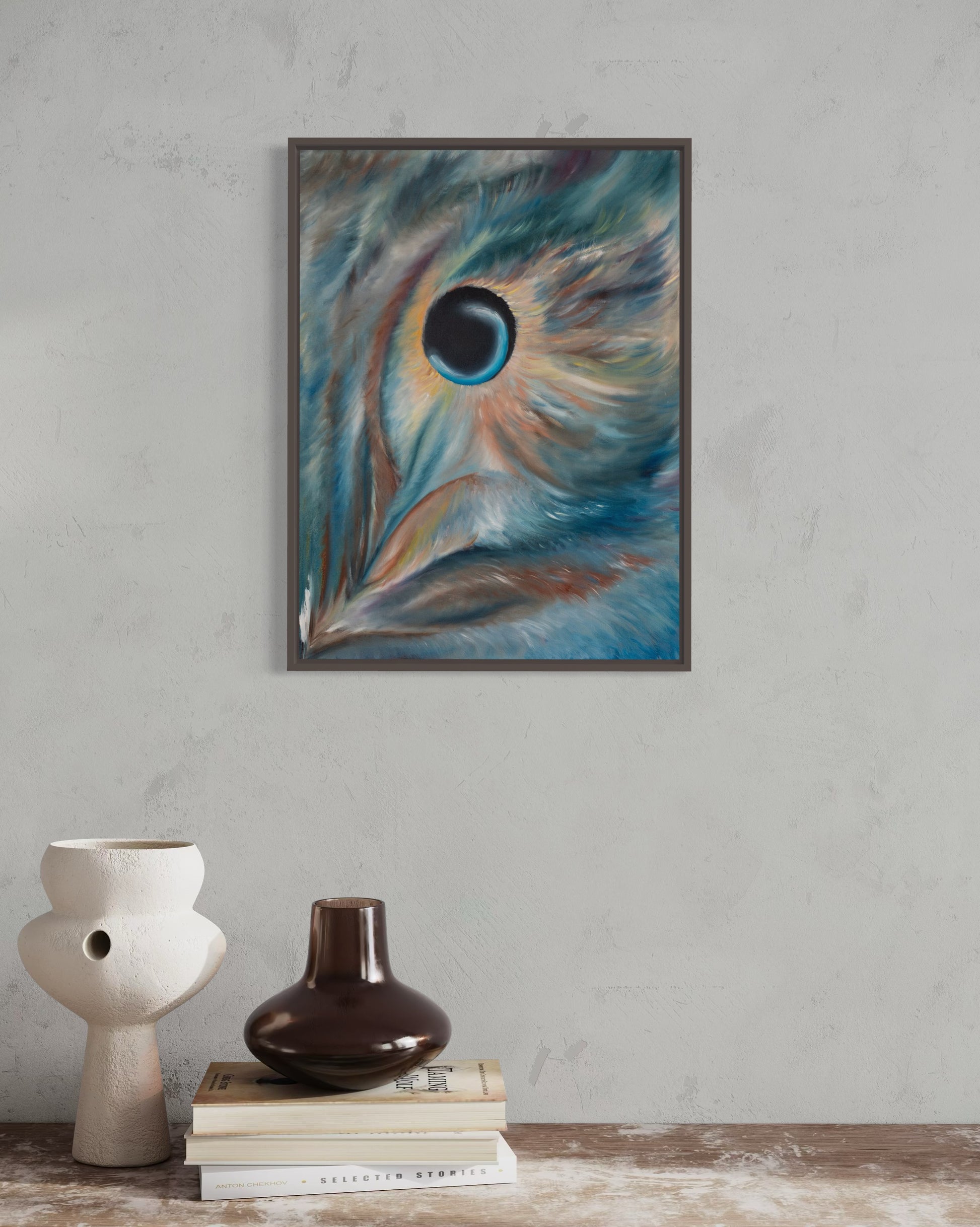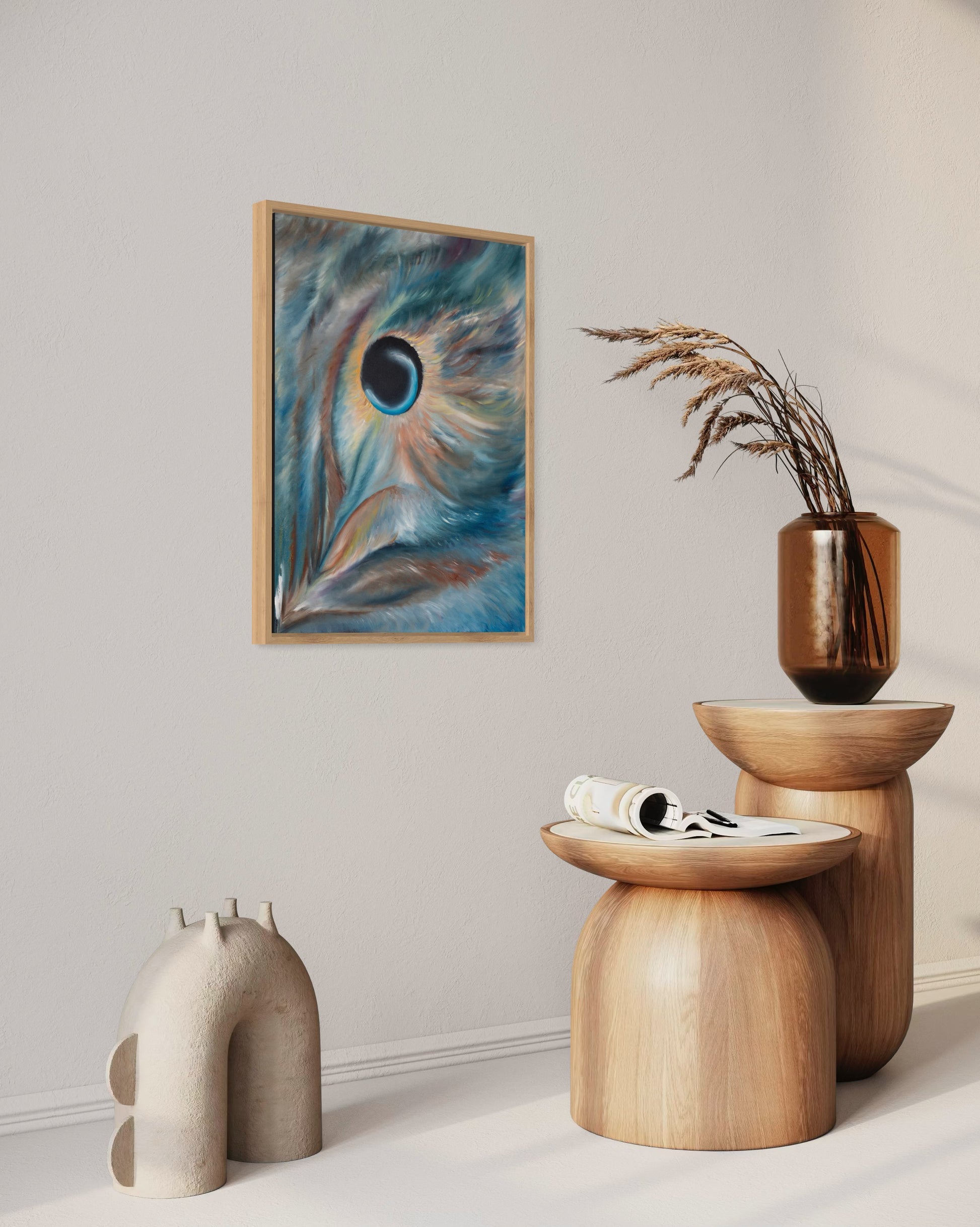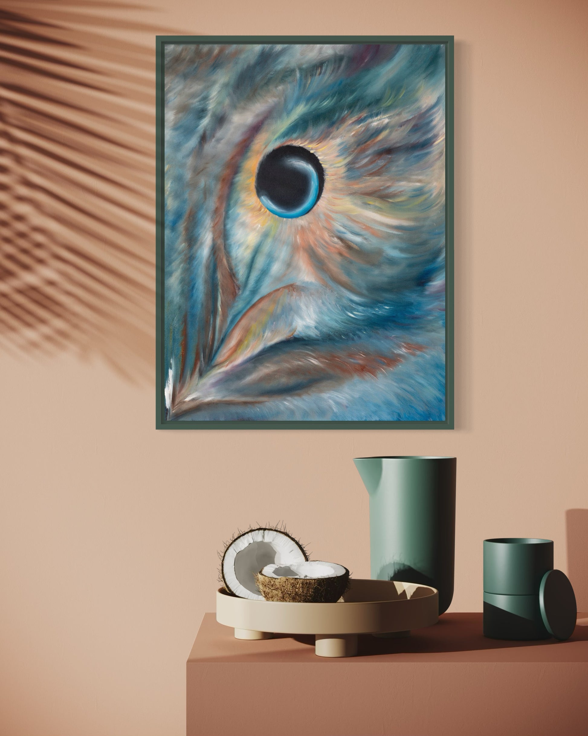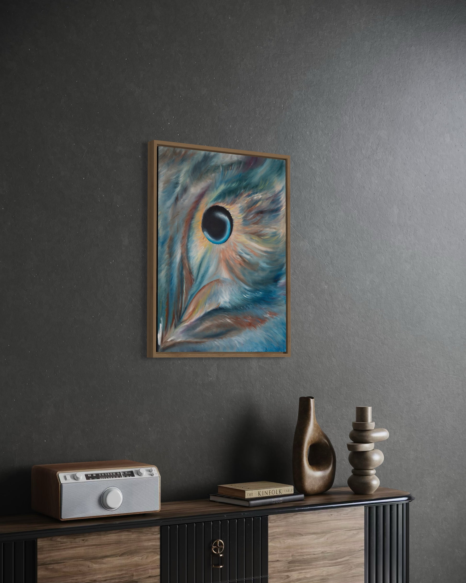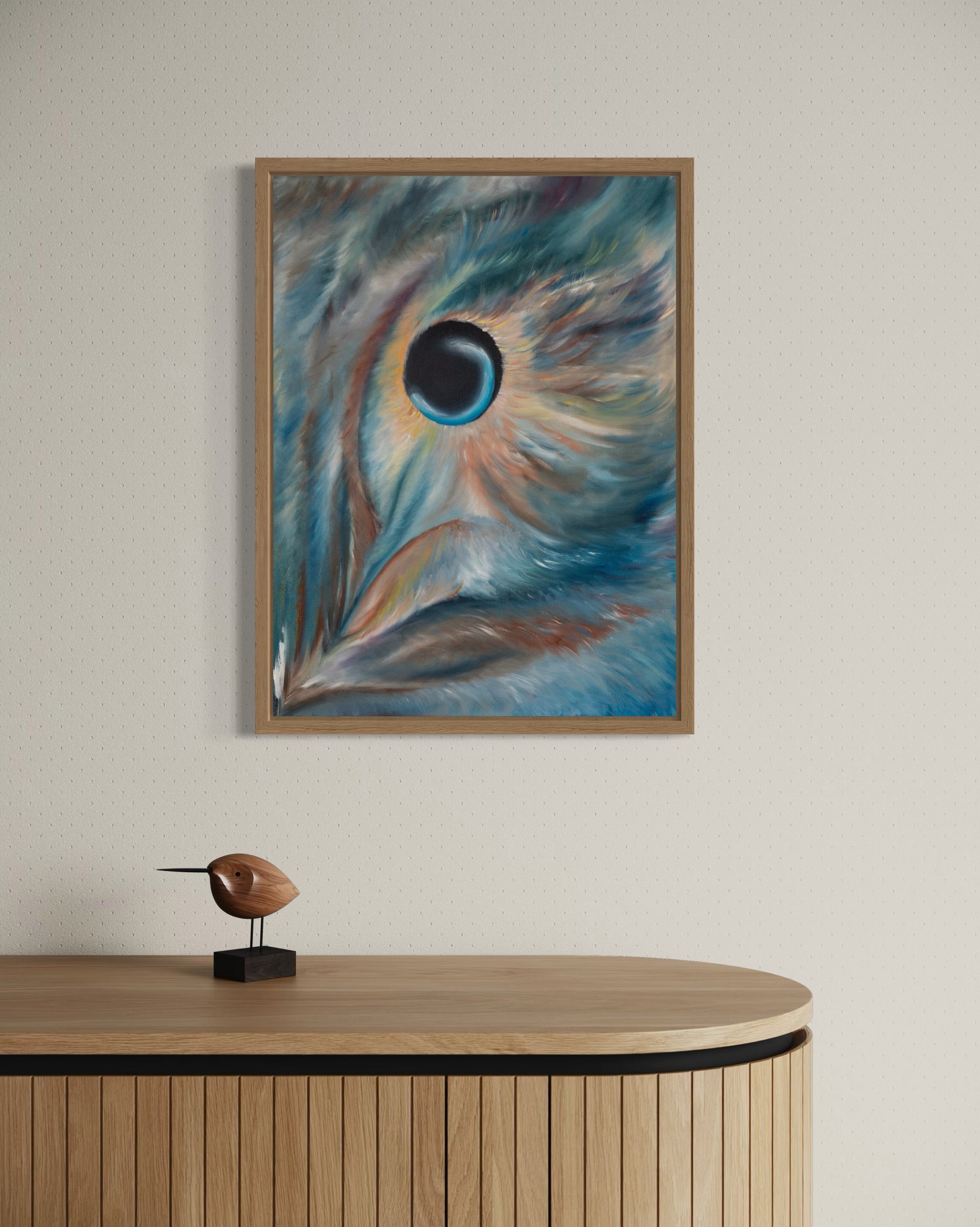“Oculus Noctis” arrives exactly as shown, securely stretched on its original wooden frame. No additional stretching required. Hang it immediately or frame it to suit your vision. Frames in photos are for display inspiration only and are not included.