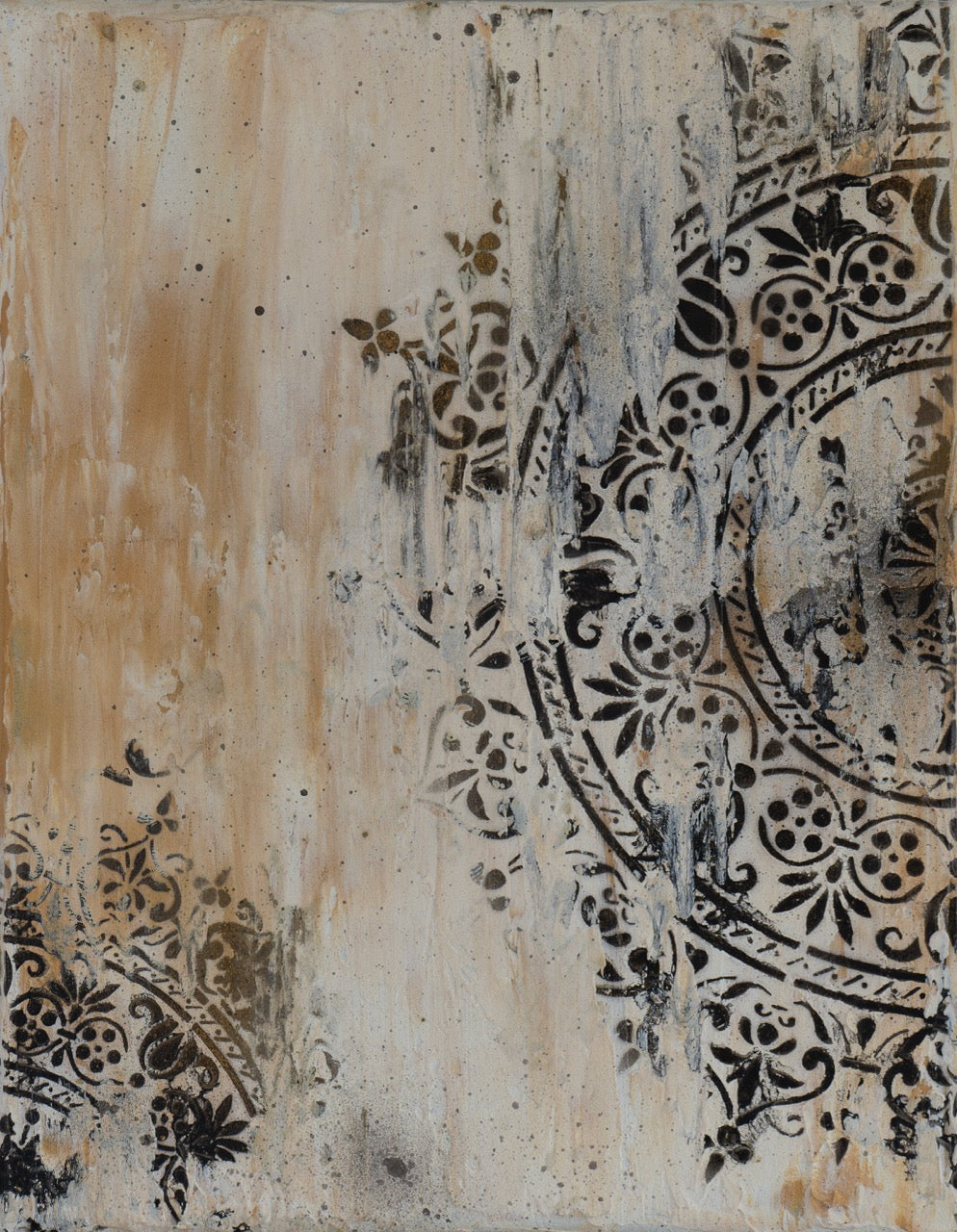 The Triptych unites three 14 x 11" paintings (Sepia, Flecks, and Fragment) into a single visual dialogue. Each piece stands alone in its abstract identity, yet together they create a balanced rhythm of texture, contrast, and motion.