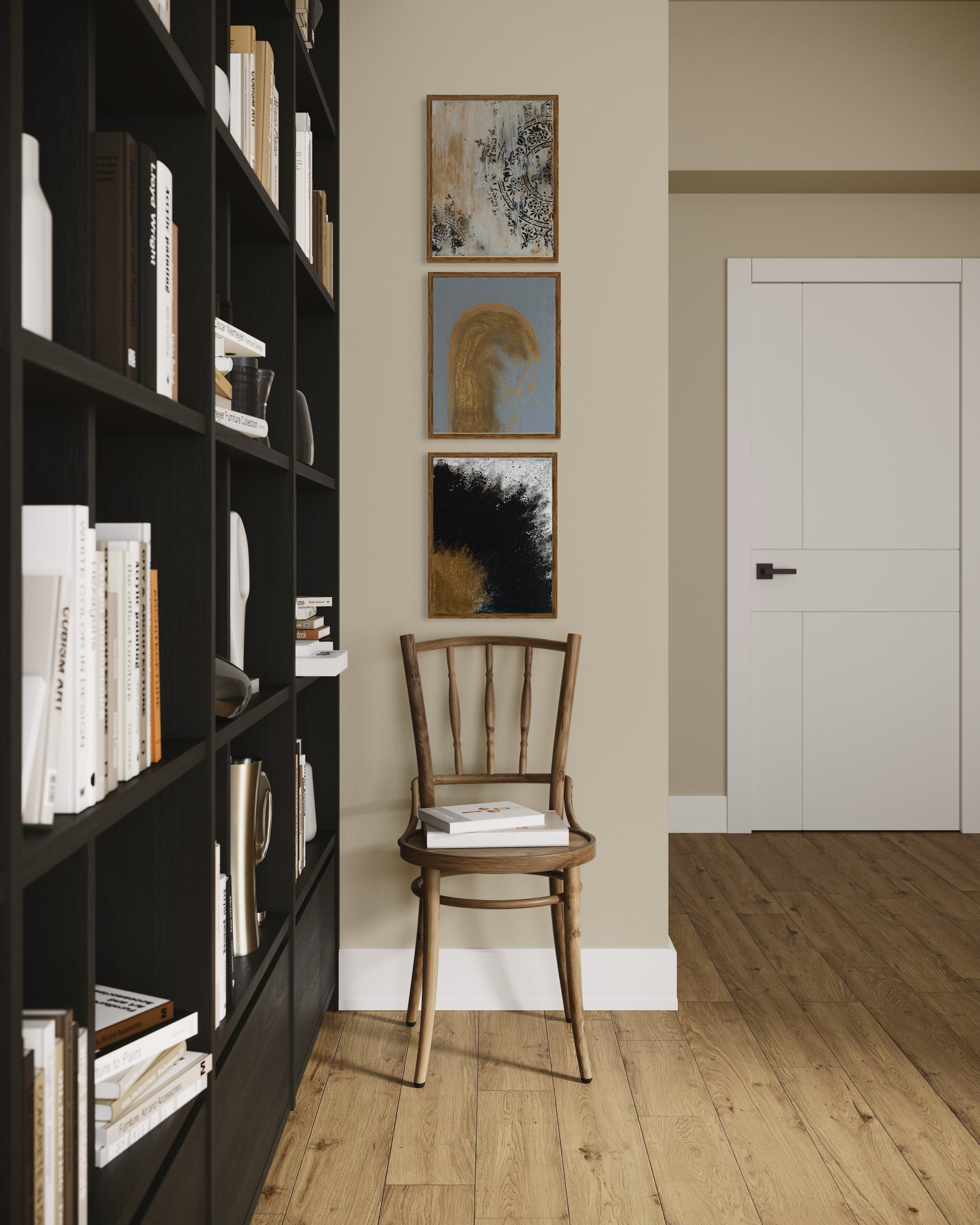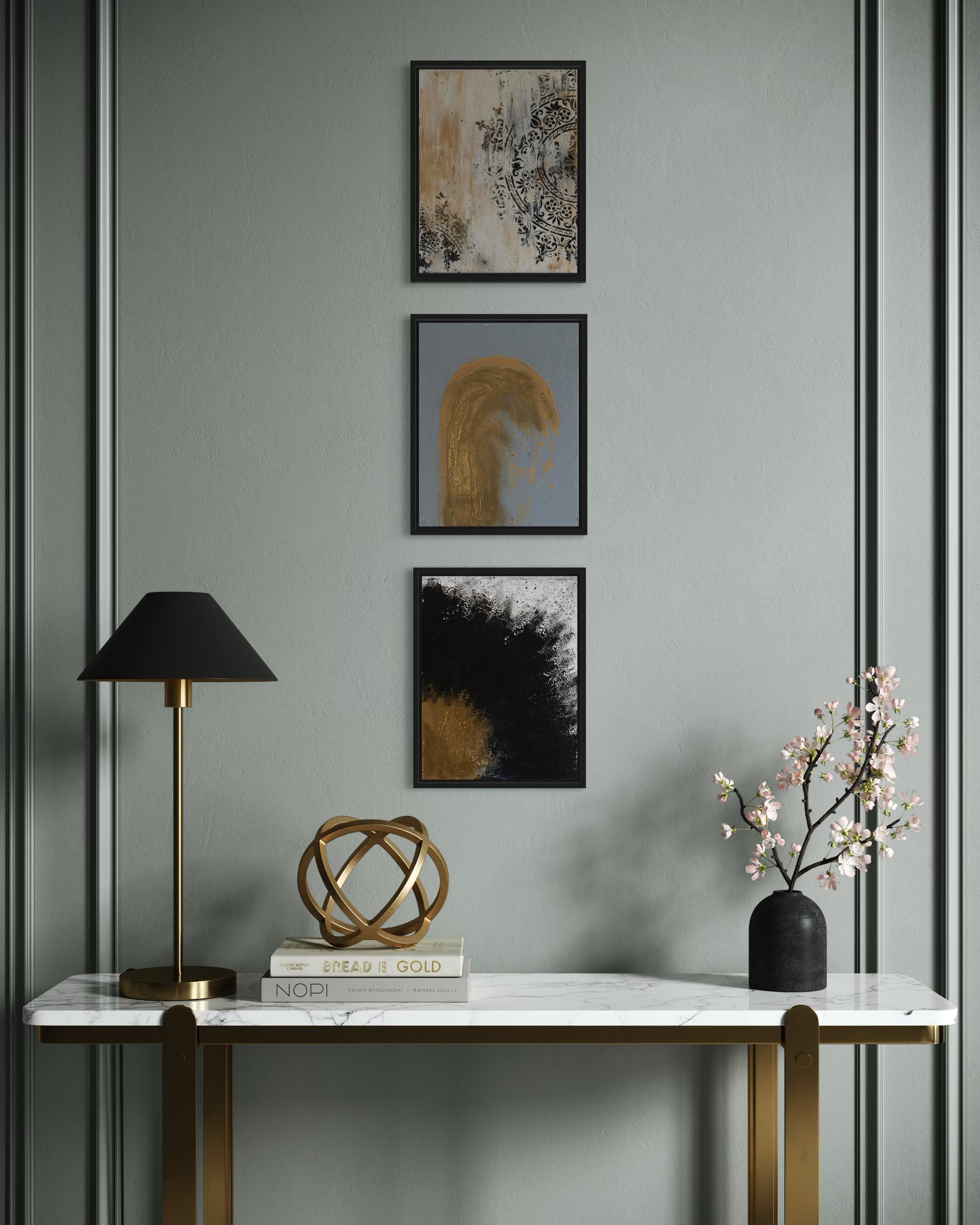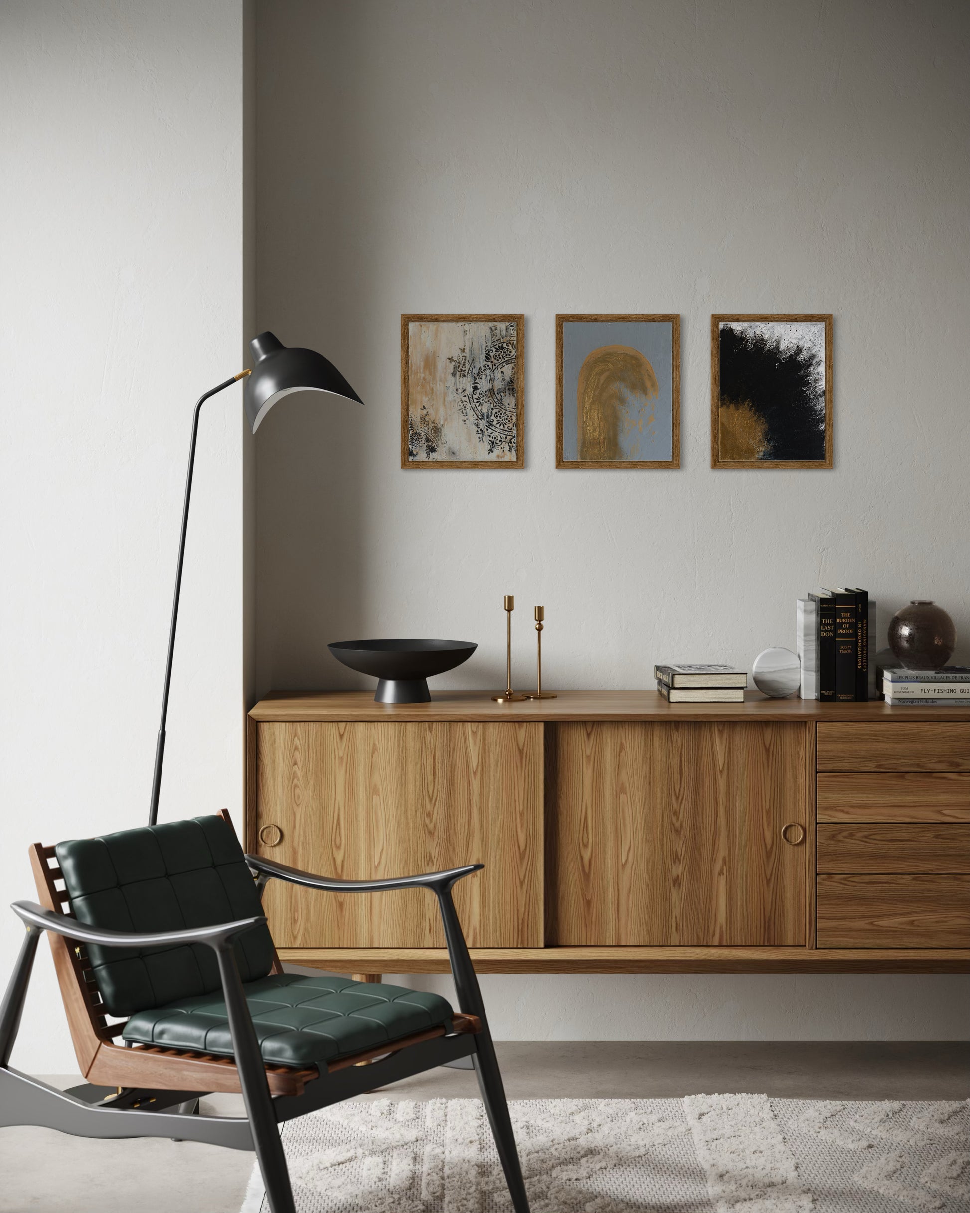 “The Triptych” arrives exactly as they're shown, securely stretched on their original wooden frames. No additional stretching required. Hang each immediately or frame them to suit your vision. Frames in photos are for display inspiration only and are not included.